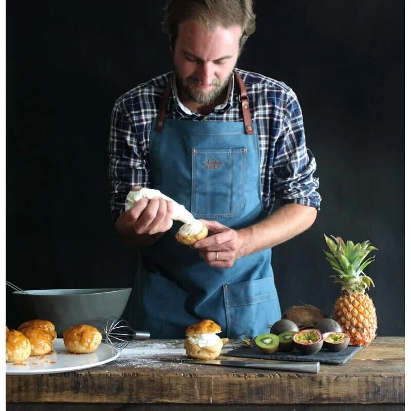 Het Alaskan Maker N°325 schort is gemaakt van katoen en leer. Het schort beschermt tegen vuil en vocht dat bij het koken op uw kleding kan komen. Door middel van een nekband en een ceintuur rond uw middel knoopt u het schort om.