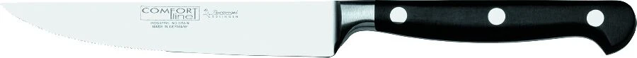 Het Burgvogel steakmes uit de Comfort Line is gemaakt van hoogwaardig messenstaal met een heft van robuust, zwart kunststof. Het heft van het mes zit aan elkaar vast door middel van 3 klinknagels. Gebruik het mes voor het snijden van steak of andere stukken vlees.