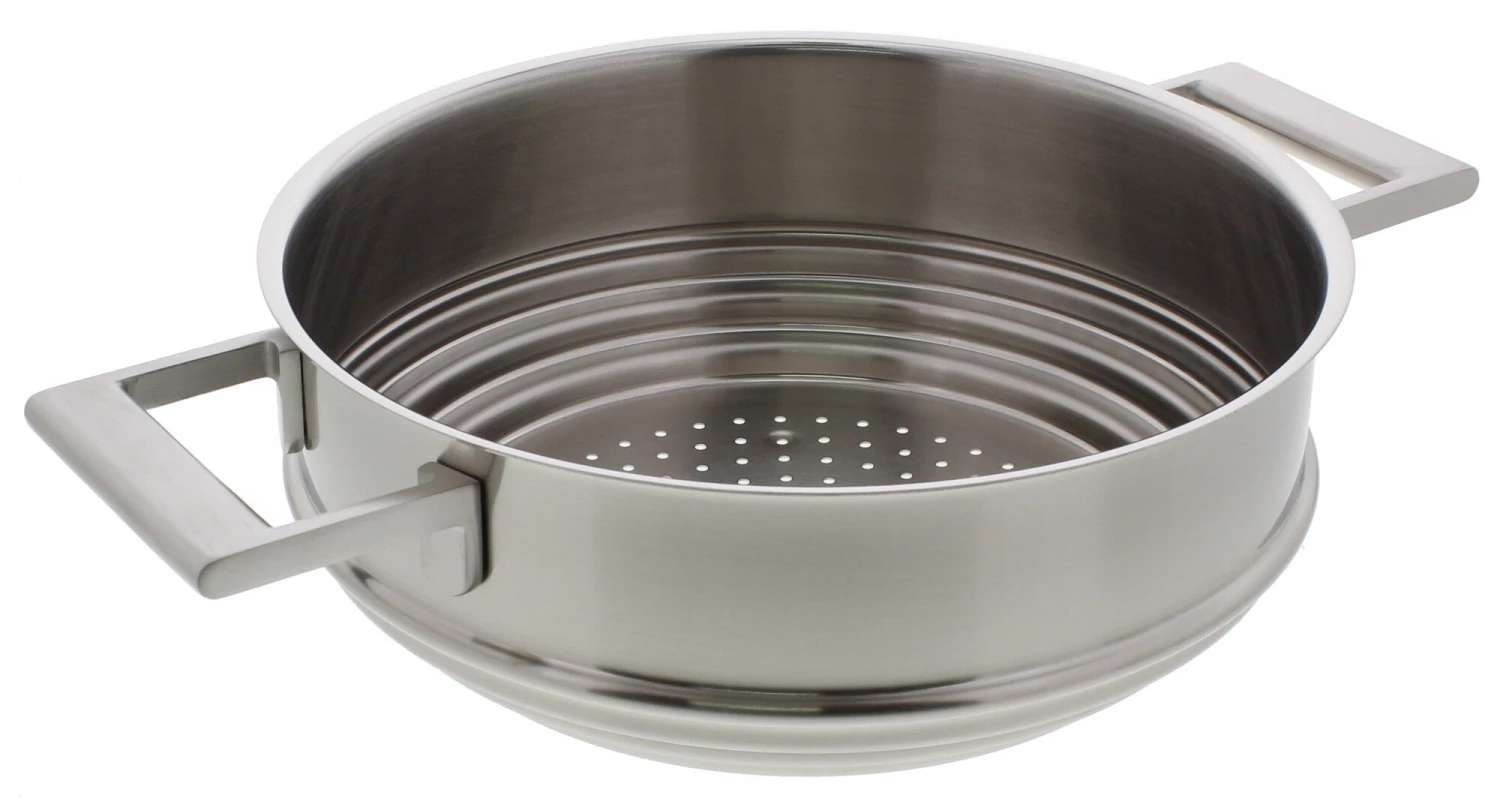De Cristel Strate stoominzet is gemaakt van roestvrij staal en heeft een bovendiameter van 24 cm. De inzet is 9,5 cm hoog en is aan de onderzijde getrapt. Hierdoor past de inzet op alle Cristel Strate kookpannen van 20, 22 en 24 cm in diameter. De handgrepen zitten vast aan de zijkant van de inzet gemonteerd. Gebruik de stoominzet om eenvoudig gerechten te stomen boven een Cristel Strate kookpan.