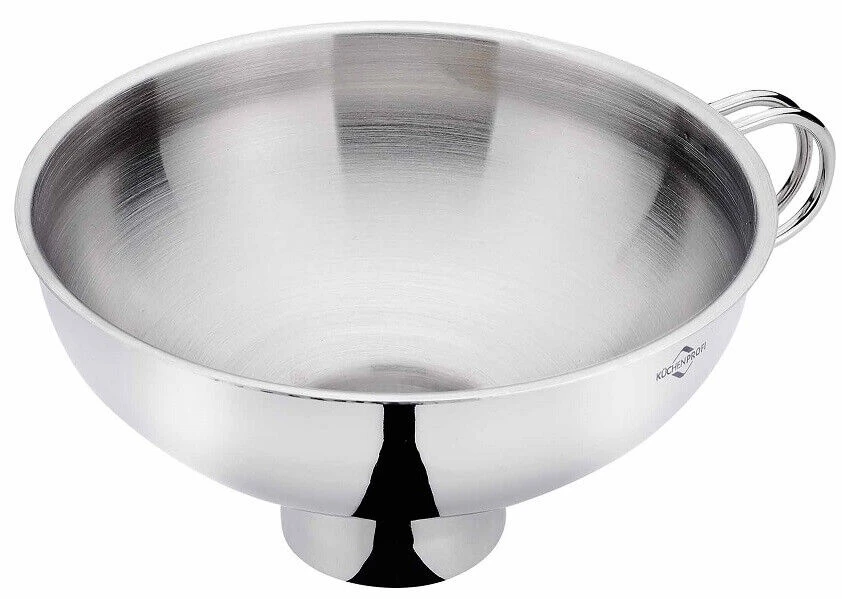 De Küchenprofi jamtrechter is vervaardigd uit roestvrij staal en heeft een diameter van 12,7 cm. De opening aan de onderzijde van de trechter is groot genoeg om ook dikke vloeistoffen als jam door te laten. Gebruik de trechter voor het vullen van een sifon of kidde, potten en flessen.