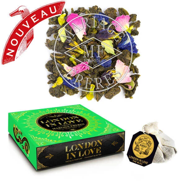 Mariage Frères-thee komt in een zwart doosje met een inhoud van 30 zakjes thee. De London in Love is een bloemige blauwe thee met tonen van munt, lavendel en rozenblaadjes.