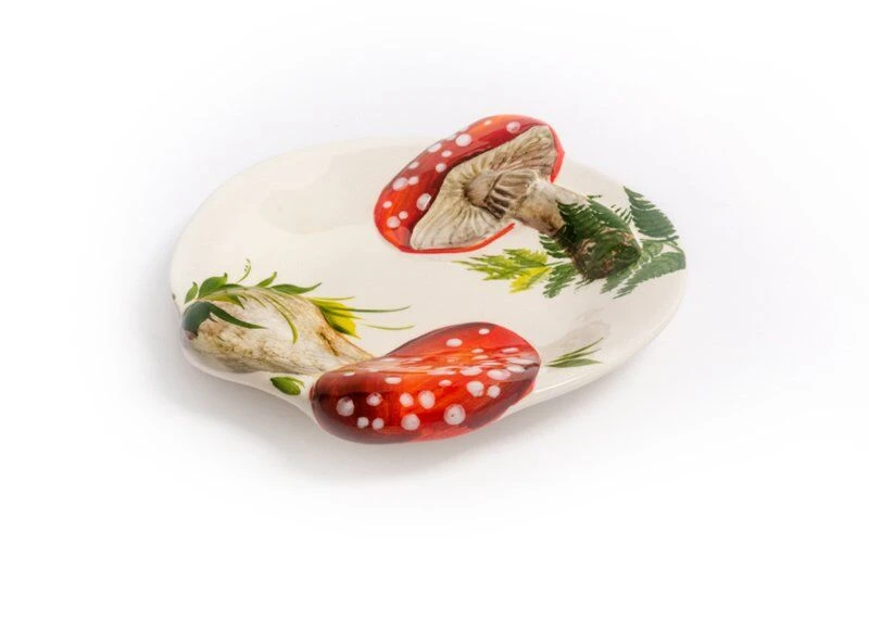 Oldenhof’s bord is voorzien van handgeschilderde rood/witte paddenstoelen. Het bord is gemaakt van keramiek en heeft een diameter van 21 cm. Gebruik het design als decoreer- en serveerbord.