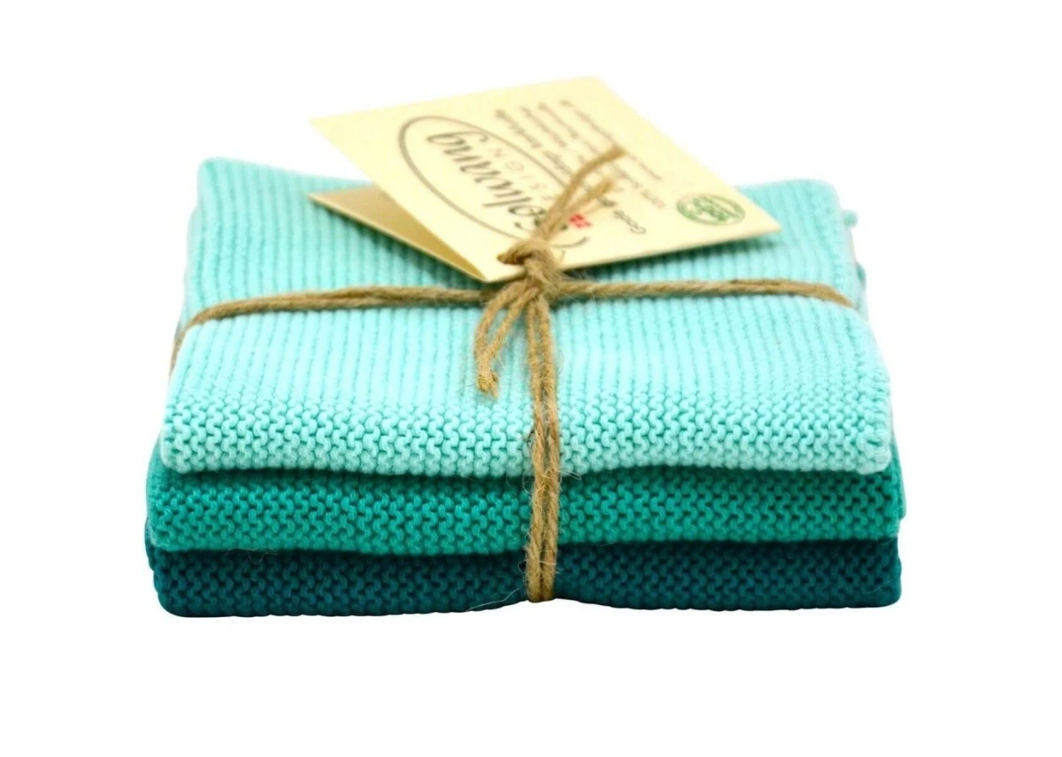 De Solwang Design vaatdoeken zijn vervaardigd uit 100% eco-tex katoen. De set van 3 vaatdoeken komen in 3 verschillende tinten turquoise. De doeken zijn 25 cm lang, 25 cm breed en hebben door de breitechniek uitstekende vocht opnemende eigenschappen.
