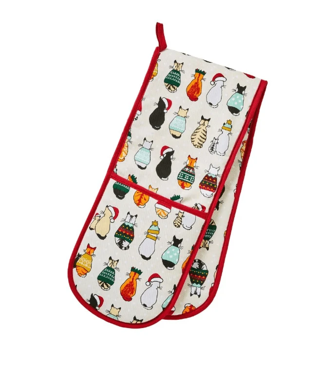 De kerstvariant van de Cats in Waiting lange pannenlap van Ulster Weavers is vervaardigd van katoen en voorzien van een polyester vulling voor isolatie. De lange pannenlap is beige met rood van kleur en is voorzien van een kattenprint in kerstsferen. Gebruik de pannenlap op hete pannen van het fornuis of uit de oven te pakken. De pannenlap is 88 cm lang en 18 cm breed.