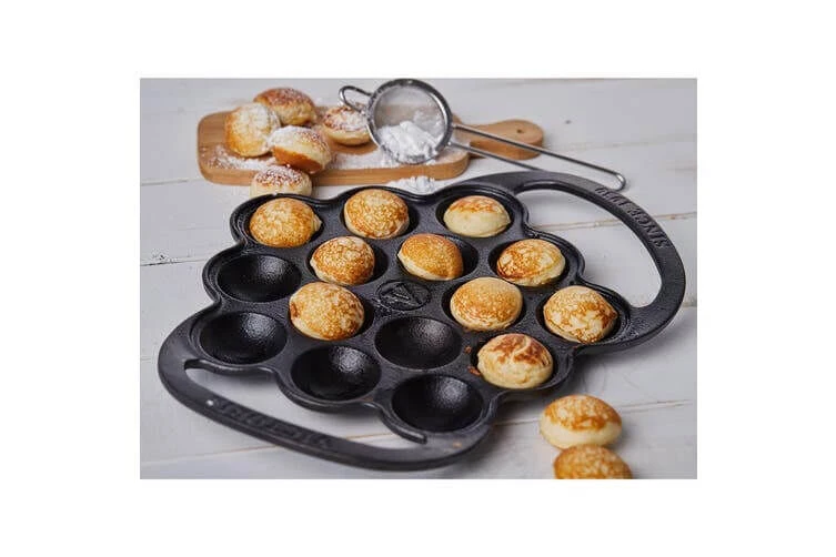 De Victoria poffertjespan is vervaardigd van geëmailleerd gietijzer. Het gietijzer zorgt voor een zeer gelijkmatige verspreiding van de warmte door de pan. 2 handgrepen zorgen voor extra draaggemak van de poffertjespan. Gebruik de ronde poffertjesplaat voor de bereiding van 15 poffertjes per keer.